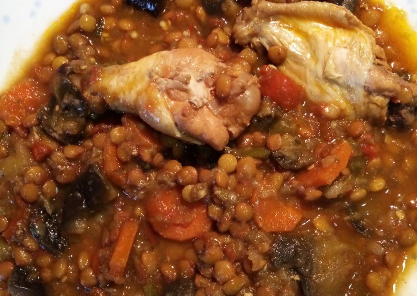 Lentejas guisadas con verduras y alitas de pollo, al chun chun