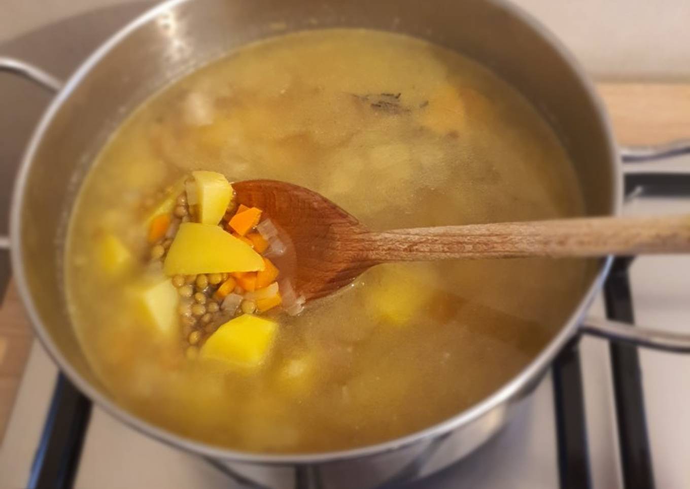 - Lo siguiente es echar las lentejas y el caldo de verduras, yo suelo echarle un litro y si luego veo que se queda sin líquido, echo un poquito más. Ahora salamos, echamos un chorrito de aceite de oliva, el puñado de arroz y la hoja de laurel. (si tengo tomillo también le echo un tallito).