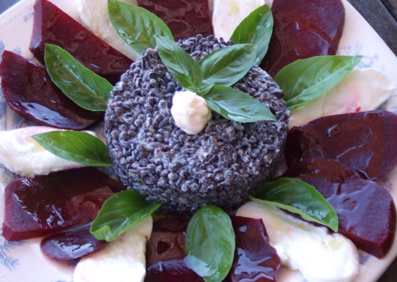 - Poner la mezcla de arroz en el centro de una fuente, alrededor el mozzarella escurrido, y la remolacha.