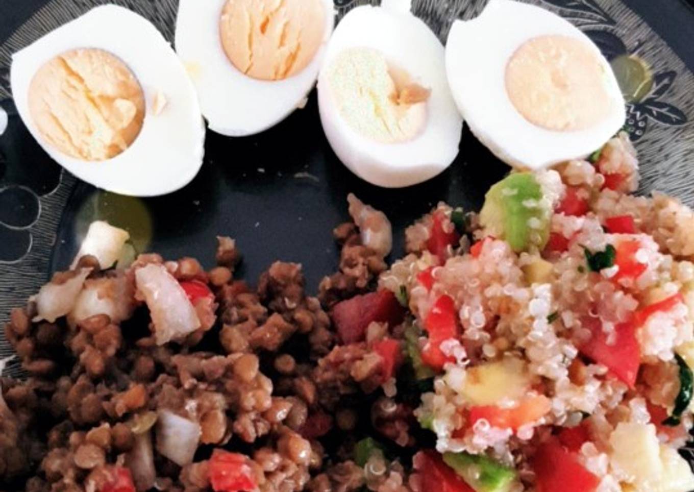 - Ponemos a hervir los huevos, mientras se cocinan las lentejas y la quinoa. Vamos troceando la cebolla, el ajo, el pimiento, podemos añadir medio aguacate.