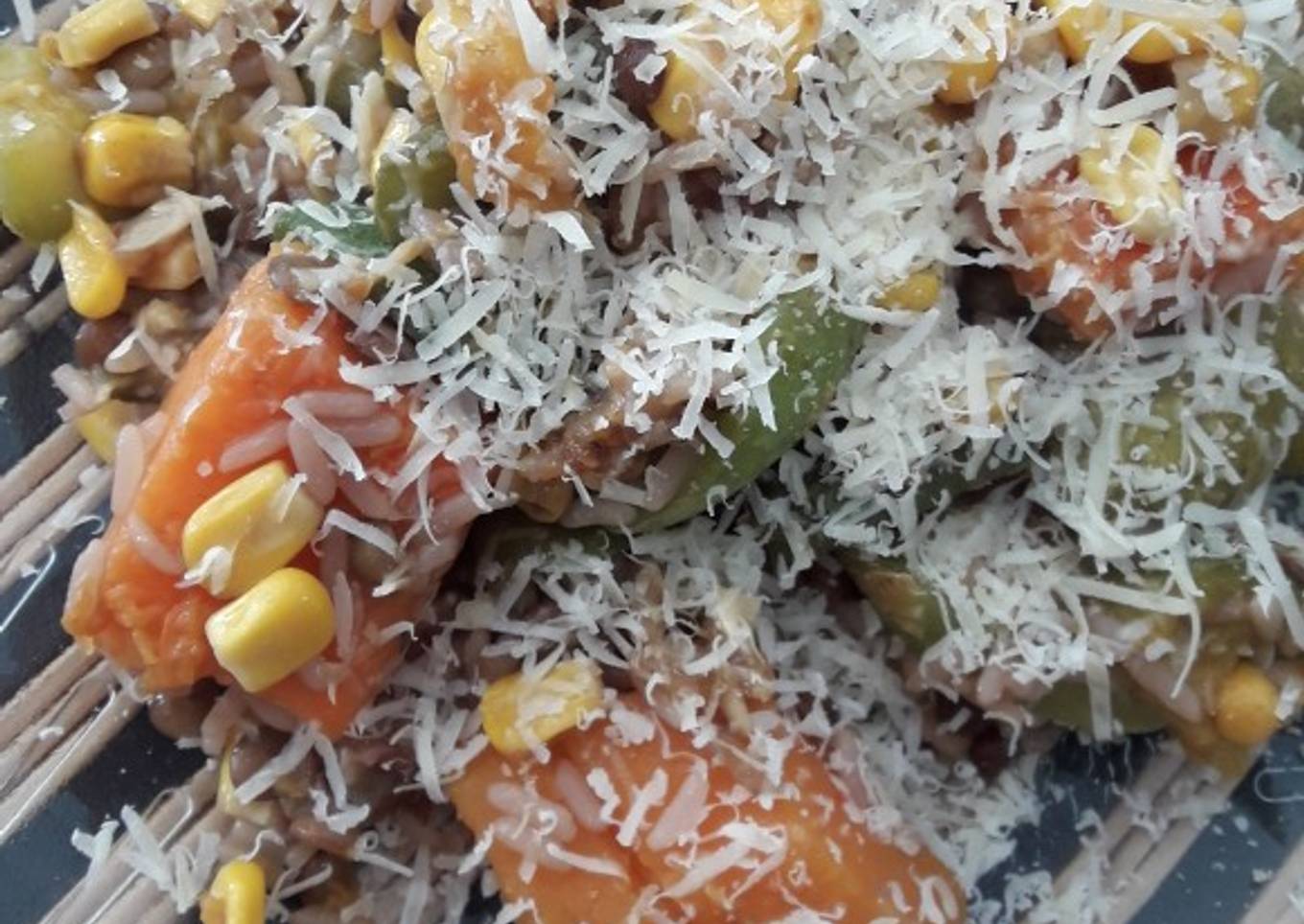 - Agregar en el sartén de las verduras el choclo y el agua de cocción del arroz y las lentejas y cocinar